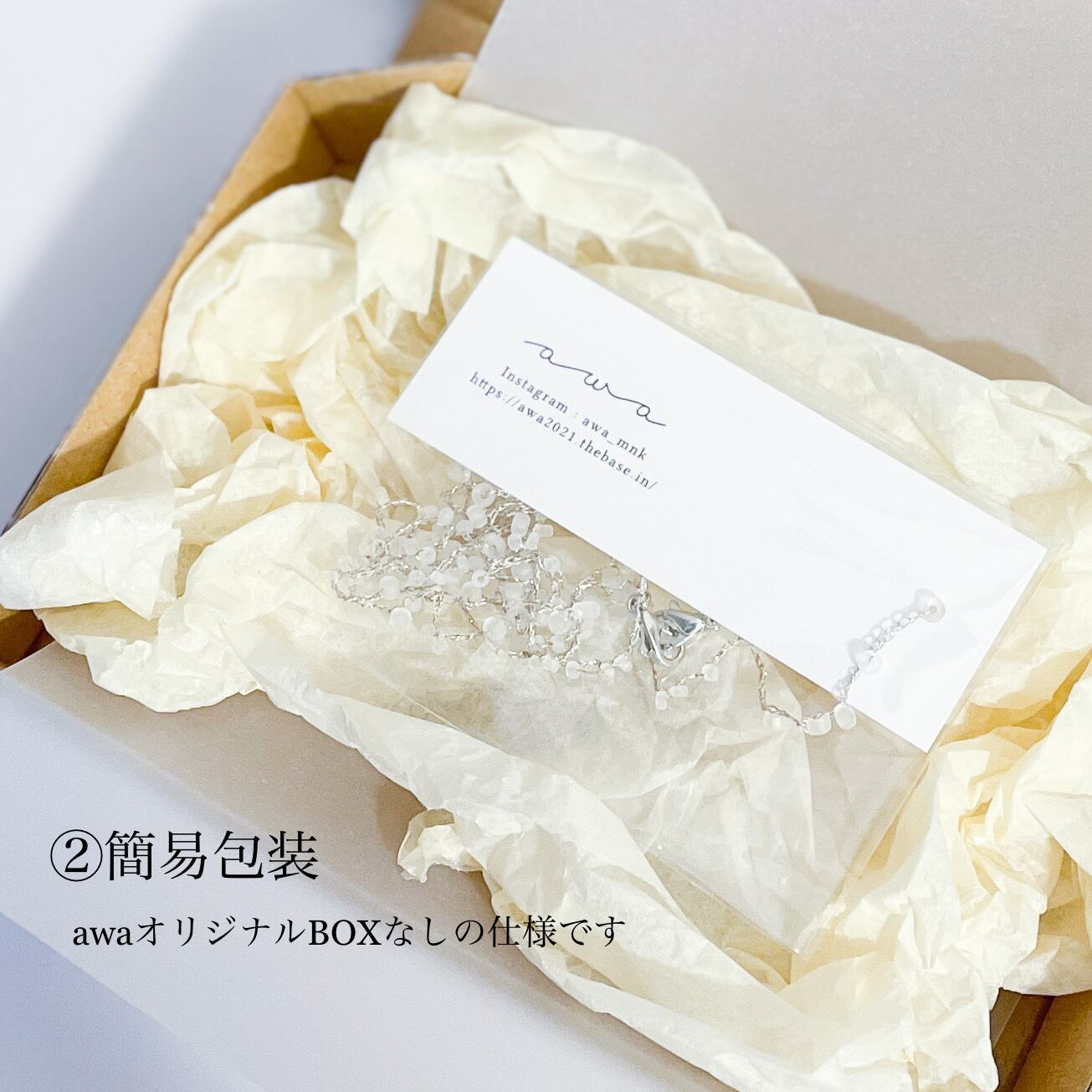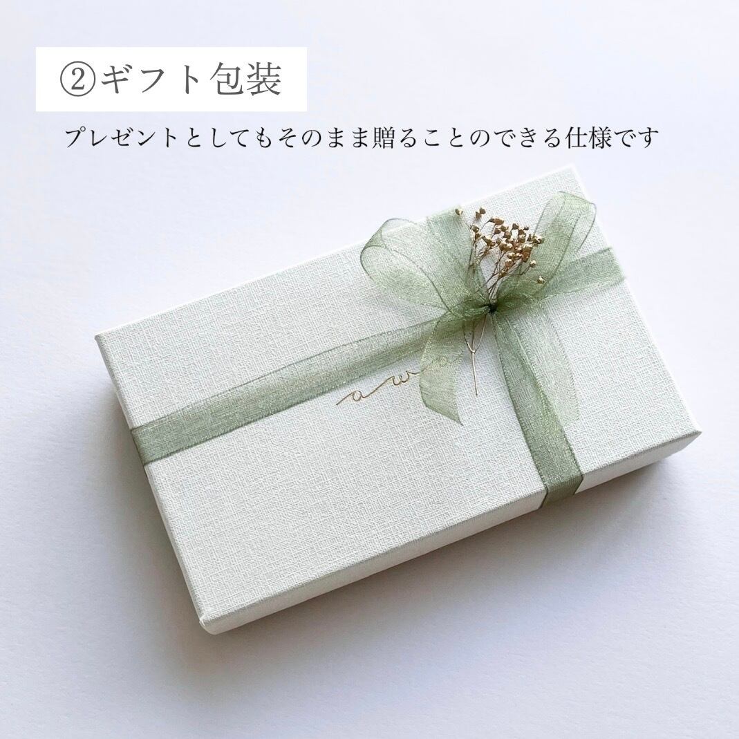 awaの箔押しオリジナルBOX、リボン、ドライフラワーを添えた包装